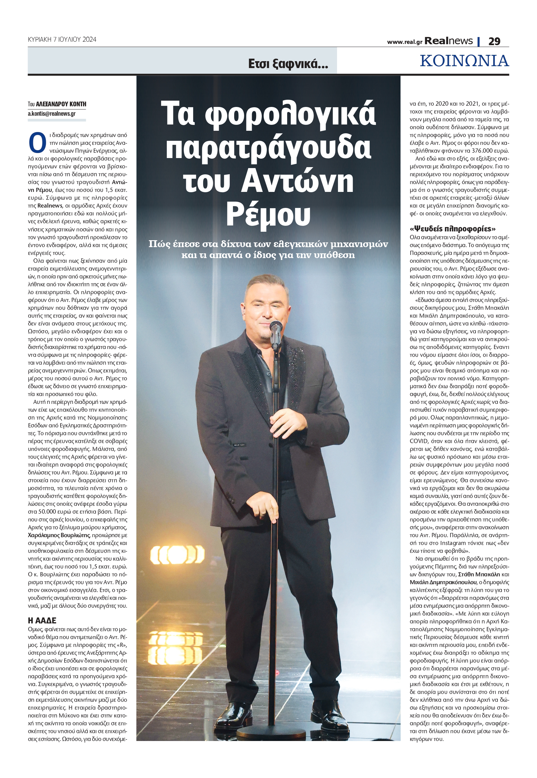 Πώς έπεσε στα δίχτυα των ελεγκτικών μηχανισμών ο Αντώνης Ρέμος και τι απαντά ο ίδιος. Οι διαδρομές των χρημάτων από την πώληση μιας εταιρείας Ανανεώσιμων Πηγών Ενέργειας, αλλά και οι φορολογικές παραβάσεις προηγούμενων ετών φέρονται να βρίσκονται πίσω από τη δέσμευση της περιουσίας του γνωστού τραγουδιστή Αντώνη Ρέμου, έως του ποσού του 1,5 εκατ. ευρώ.