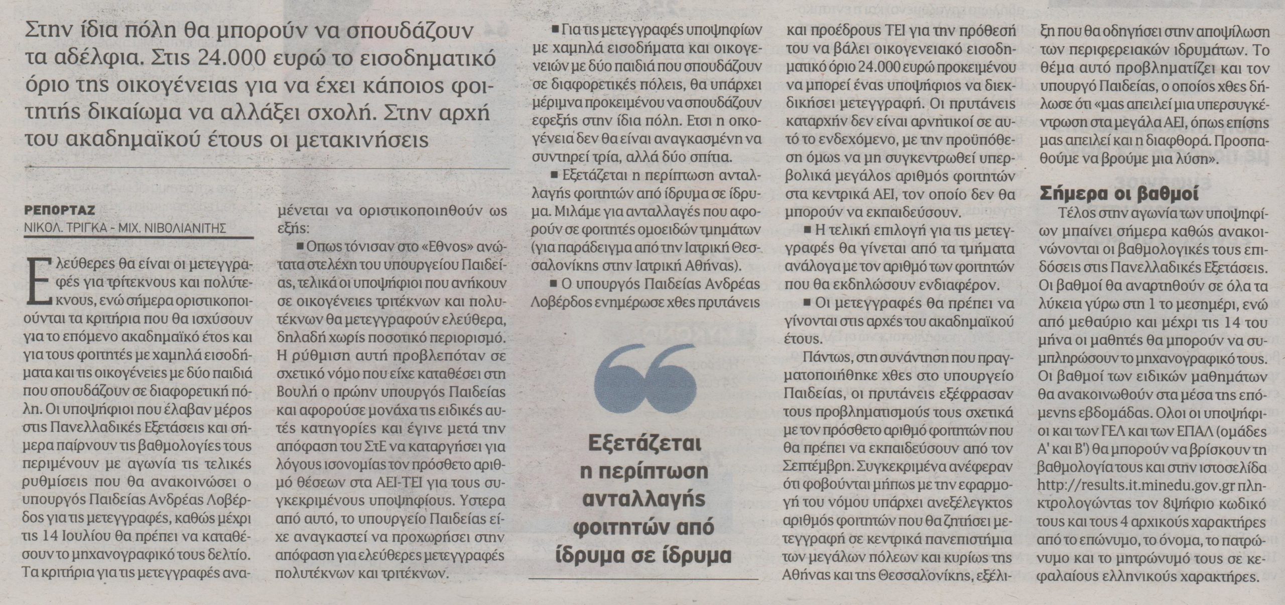 Στην ίδια πόλη θα μπορούν να σπουδάζουν τα αδέλφια. Στις 24.000 ευρώ το εισοδηματικό όριο της οικογένειας για να έχει κάποιος φοιτητής δικαίωμα να αλλάξει σχολή. Στην αρχή του ακαδημαϊκού έτους οι μετακινήσεις.