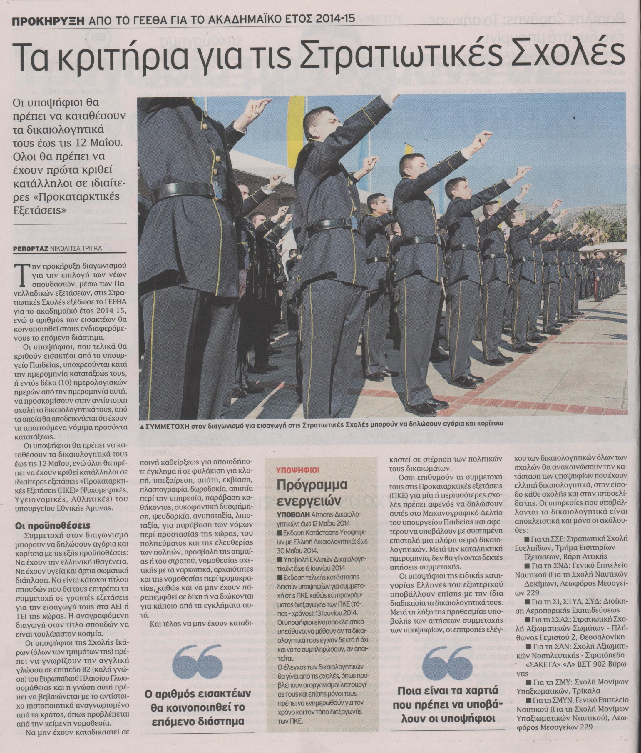 Tην προκήρυξη διαγωνισμού για την επιλογή των νέων σπουδαστών, μέσω των Πανελλαδικών εξετάσεων, στις στρατιωτικές σχολές εξέδωσε το ΓΕΕΘΑ για το ακαδημαϊκό έτος 2014-15, ενώ ο αριθμός των εισακτέων θα κοινοποιηθεί στους ενδιαφερόμενους το επόμενο διάστημα. Οι υποψήφιοι, που τελικά θα κριθούν εισακτέοι από το υπουργείο Παιδείας, υποχρεούνται κατά την ημερομηνία κατατάξεώς τους, ή εντός δέκα ημερολογιακών ημερών από την ημερομηνία αυτή, να προσκομίσουν στην αντίστοιχη σχολή τα δικαιολογητικά τους, από τα οποία θα αποδεικνύεται ότι έχουν τα απαιτούμενα νόμιμα προσόντα κατατάξεως.