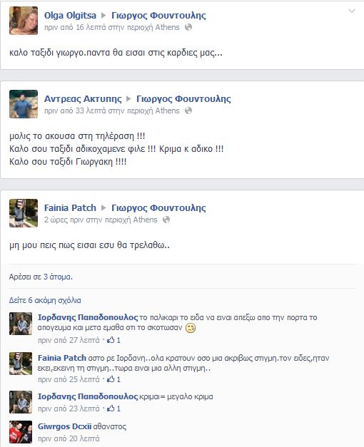 Φίλοι και γνωστοί του 27χρονου Γιώργου Φουντούλη, μόλις ενημερώθηκαν πως είναι ο νεκρός της επίθεσης στο Νέο Ηράκλειο, επισκέφθηκαν τη σελίδα του νεαρού στο Facebook και έγραψαν μηνύματα συμπαράστασης και συλλυπητήρια.