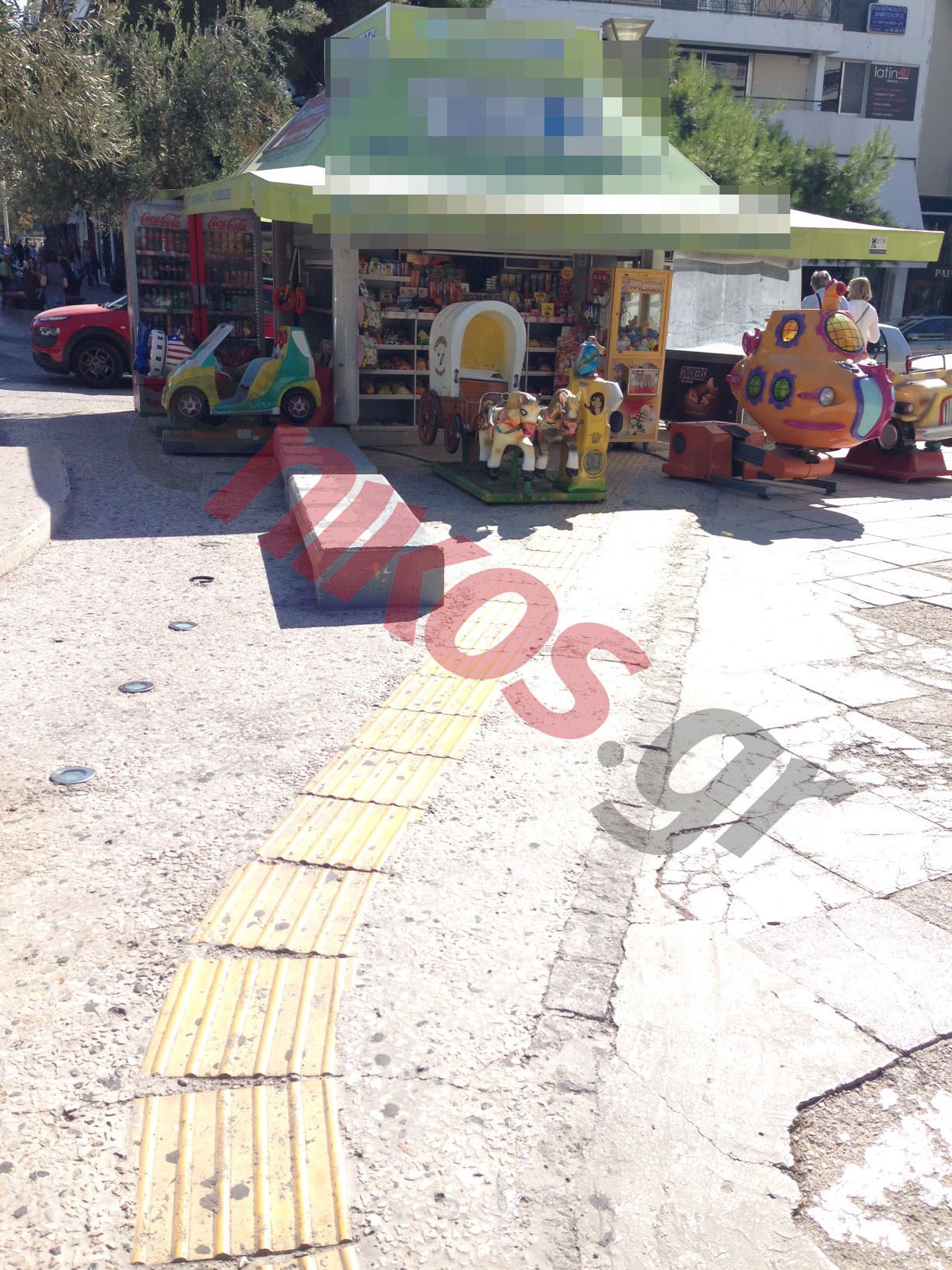 Τα παιχνίδια που έχουν τοποθετηθεί περιμετρικά ενός περιπτέρου στο κέντρο της Γλυφάδας, εμποδίζουν τη διέλευση ατόμων χωρίς όραση, καθώς έχουν εγκατασταθεί επάνω στον οδηγό όδευσης τυφλών.