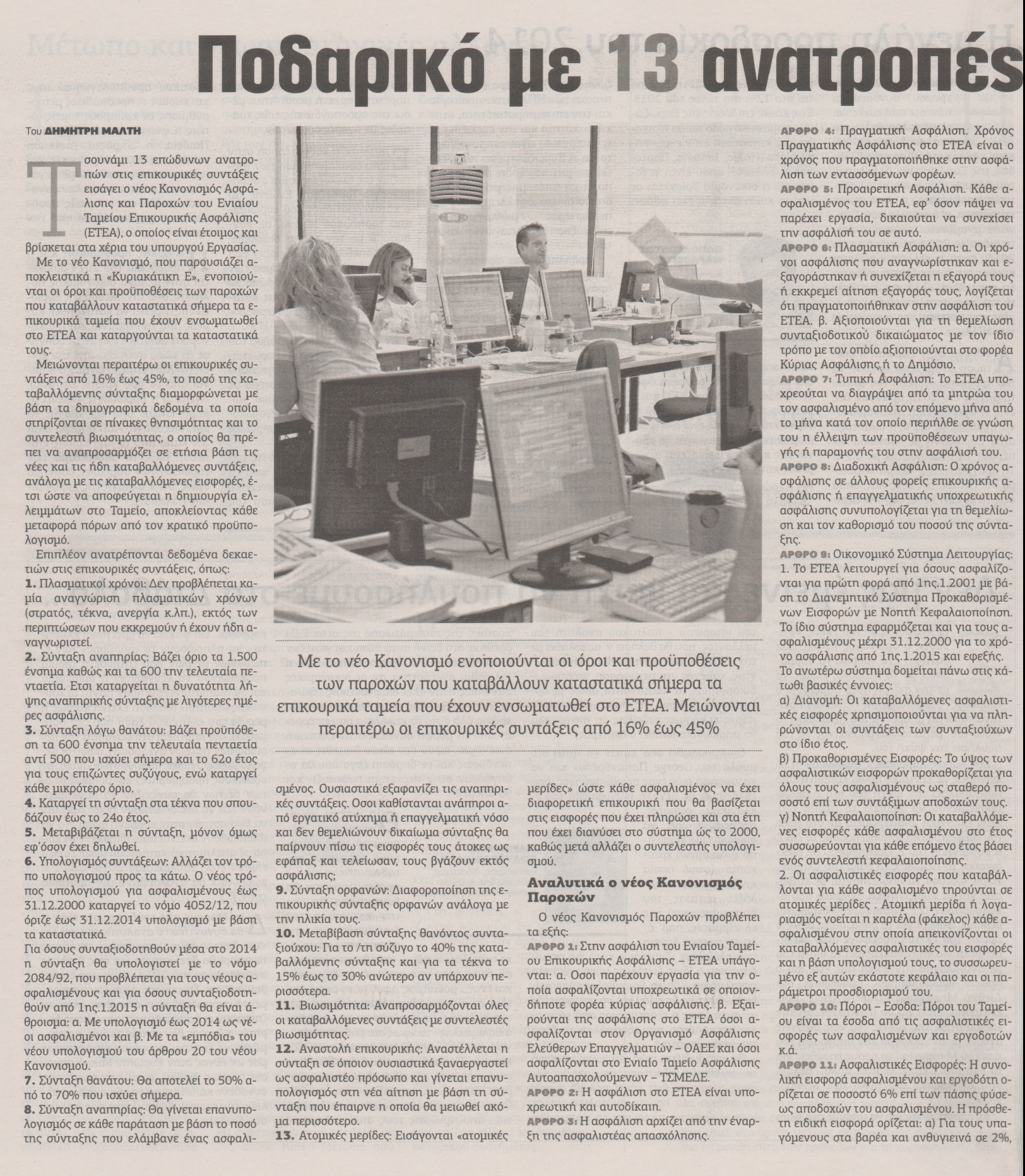 Τσουνάμι 13 επώδυνων ανατροπών στις επικουρικές συντάξεις εισάγει ο νέος Κανονισμός Ασφάλισης και Παροχών του Ενιαίου Ταμείου Επικουρικής Ασφάλισης (ΕΤΕΑ), ο οποίος είναι έτοιμος και βρίσκεται στα χέρια του υπουργού Εργασίας.