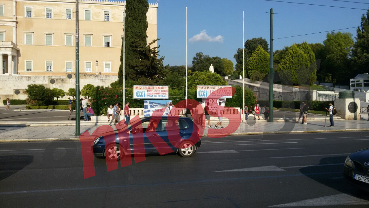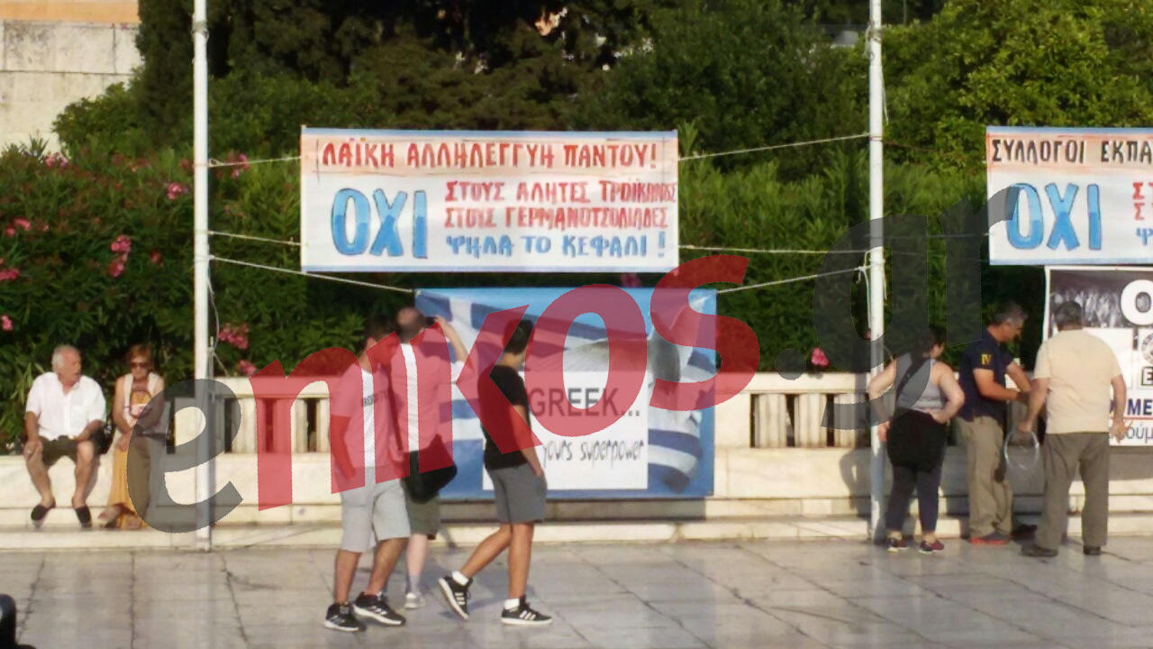 Τα πρώτα πανό στη συγκέντρωση υπέρ του «όχι» στο δημοψήφισμα αναρτώνται στην πλατεία Συντάγματος.