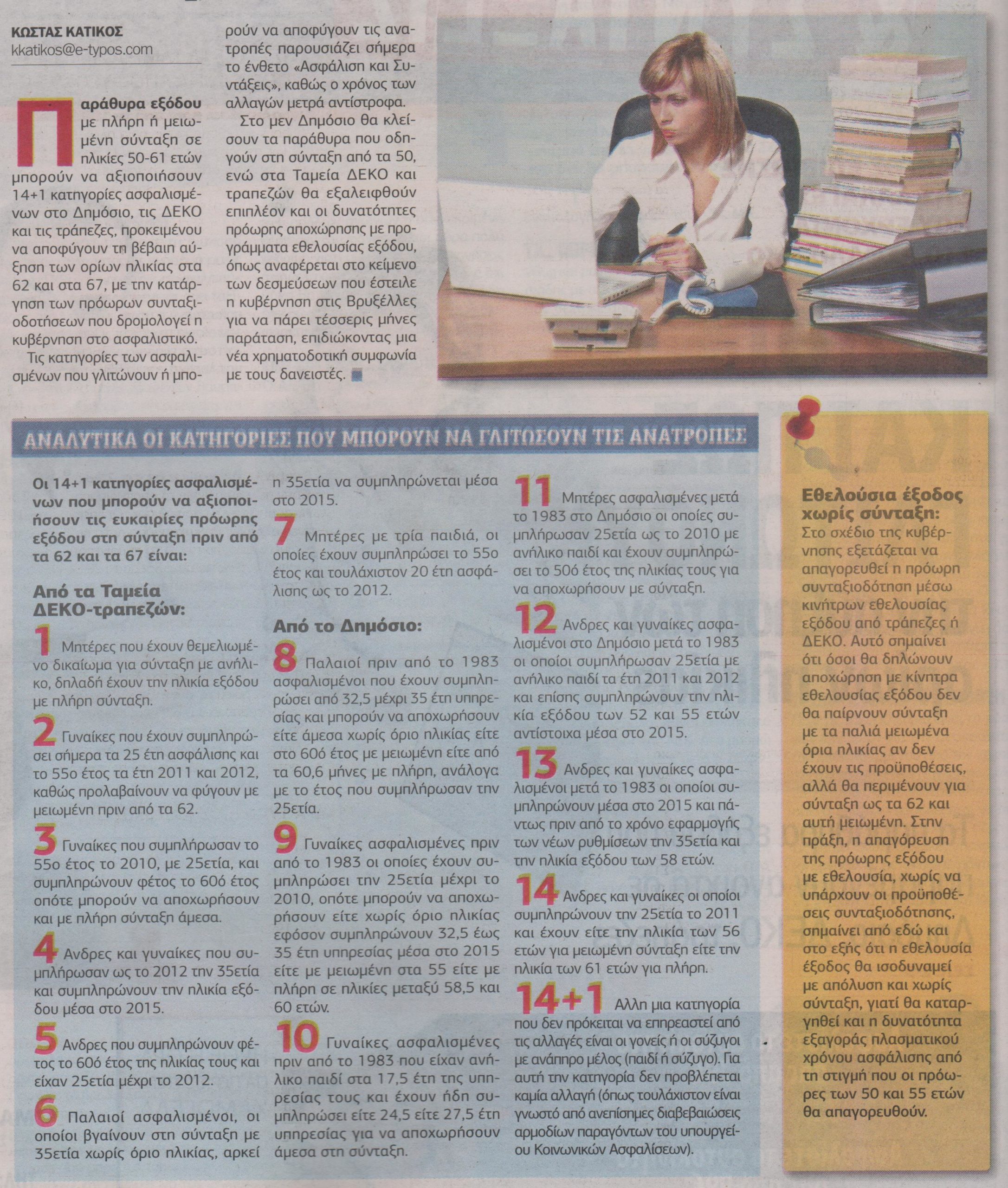 Παράθυρα εξόδου με πλήρη ή μειωμένη σύνταξη σε ηλικίες 50-61 ετών μπορούν να αξιοποιήσουν 14+1 κατηγορίες ασφαλισμένων στο Δημόσιο, της ΔΕΚΟ και τις τράπεζες, προκειμένου να αποφύγουν τη βέβαιη αύξηση των ορίων ηλικίας στα 62 και στα 67, με την κατάργηση των πρόωρων συντάξεων που δρομολογεί η κυβέρνηση στο ασφαλιστικό.