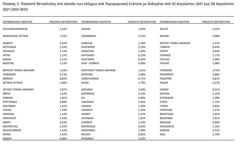 Τα ποσοστά θετικότητας ανά περιοχή, με βάση τα στοιχεία από 2 έως 8 Αυγούστου, ανακοίνωσε ο ΕΟΔΥ την Τετάρτη. Σημειώνεται πως το τελευταίο 24ωρο, επιβεβαιώθηκαν 3.475 τα νέα κρούσματα κορονοϊού. Σύμφωνα με την έκθεση, την εβδομάδα 2 Αυγούστου 2021 – 8 Αυγούστου 2021 (2021-W31) το ποσοστό θετικότητας ήταν 3.05% σε σύνολο 623.985 εργαστηριακών ελέγχων (RT-PCR/Rapid-Ag) και 0.79% σε σύνολο 709.364 αυτοδιαγνωστικών ελέγχων. Στο σύνολο των ελέγχων, το ποσοστό θετικότητας ήταν 1.47%.