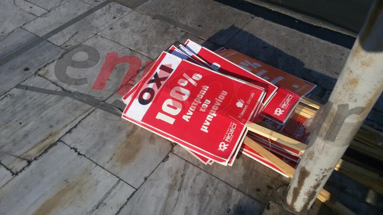“ΟΧΙ – 100% Ανατροπή του μνημονίου” είναι το σύνθημα που επικρατεί.