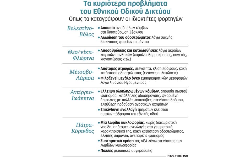 Τα προβλήματα του εθνικού οδικού δικτύου έχουν φέρει στην επιφάνεια τα πρόσφατα ατυχήματα και δυστυχήματα που σημειώθηκαν με εμπλοκή φορτηγών, αποτέλεσμα των οποίων ήταν να χαθούν δεκάδες ανθρώπινες ζωές. Από τον περασμένο Φεβρουάριο ακόμη η Ομοσπονδία Φορτηγών Αυτοκινητιστών Ελλάδος (ΟΦΑΕ) κατέγραψε τα σημαντικότερα προβλήματα στο σύνολο του εθνικού οδικού δικτύου, αλλά και ανά τμήμα, και έστειλε τις παρατηρήσεις της στα υπουργεία Υποδομών και Ανάπτυξης.