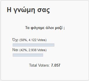 Στην σελίδα mazi-ta-fagame.gr, υπάρχει διαθέσιμο και ένα poll με την ερώτηση “Τα φάγαμε όλοι μαζί;”.Στην ψηφοφορία έχουν λάβει μέρος 7.057 άτομα, τα οποία στην πλειψηφία τους φαίνεται να διαφωνούν με την άποψη του κ.Πάγκαλου καθώς το 58% (4.122 άτομα) ψήφισαν “Όχι” ενώ το 42%, (δηλαδή 2.938 άτομα) ψήφισαν “Ναι”.