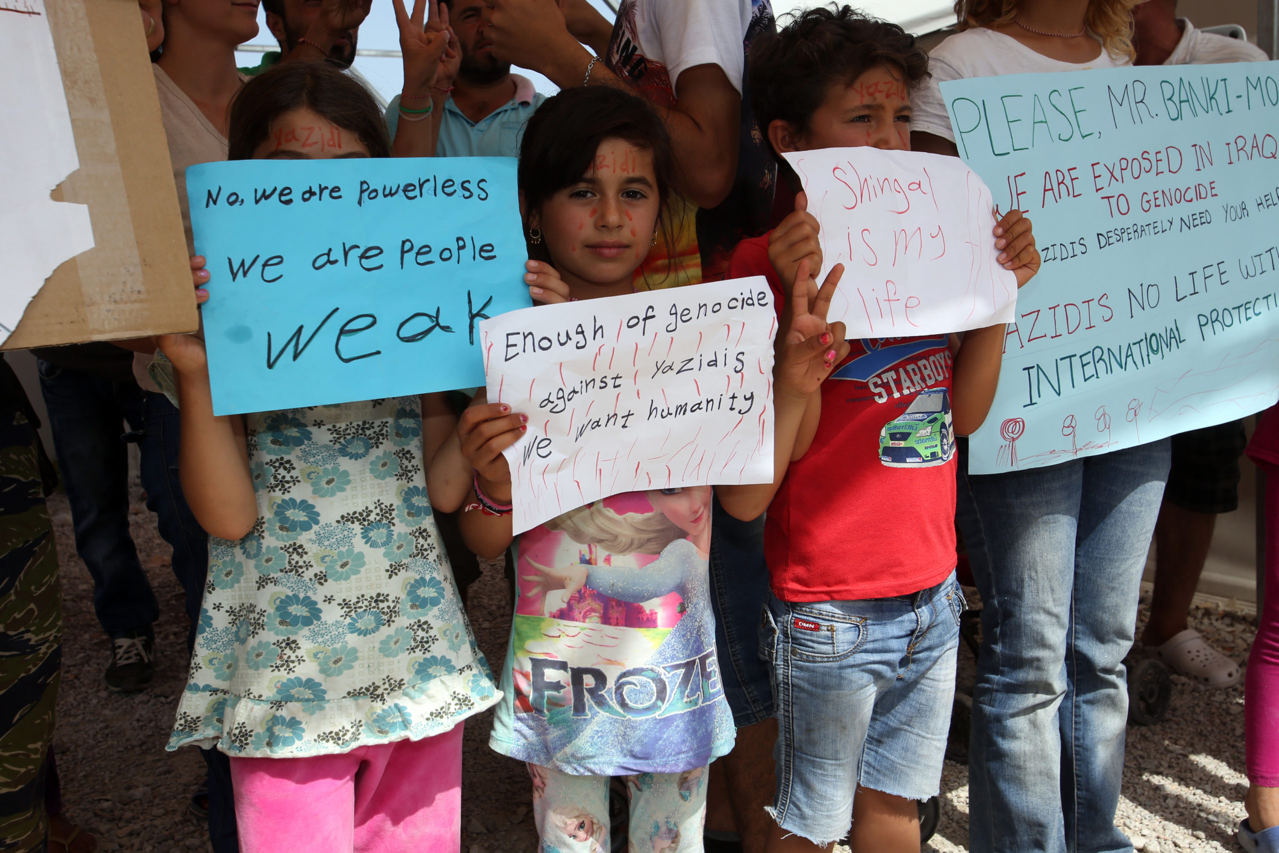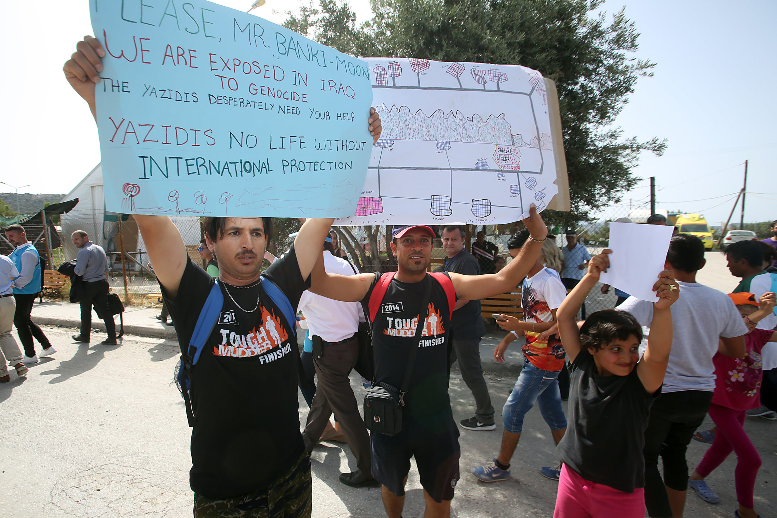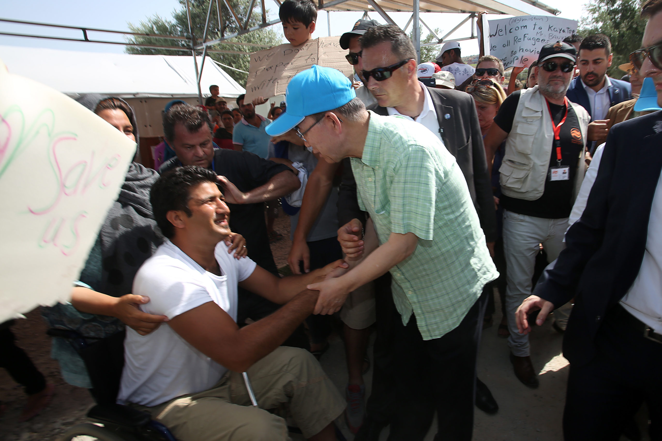 Κρατώντας πλακάτ περίμεναν τον Γενικό Γραμματέα του ΟΗΕ Μπαν Κι Μουν οι πρόσφυγες στον καταυλισμό Καρά Τεπέ, στη Λέσβο.