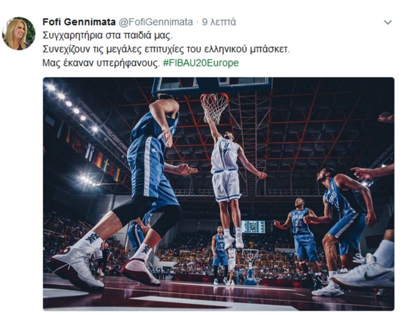 «Συγχαρητήρια στα παιδιά μας. Συνεχίζουν τις μεγάλες επιτυχίες του ελληνικού μπάσκετ. Μας έκαναν υπερήφανους» έγραψε σε ανάρτησή της στο Twitter η πρόεδρος της Δημοκρατικής Συμπαράταξης Φώφη Γεννηματά για την επιτυχία της Εθνικής Ομάδας Μπάσκετ Νέων στο Ευρωμπάσκετ.
