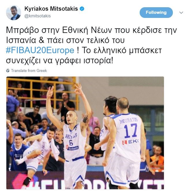Συγχαρητήρια στην Εθνική Ομάδα Νέων για την πρόκρισή της στον τελικό του Ευρωμπάσκετ Νέων Ανδρών έστειλε με ανάρτησή του στο Twitter ο πρόεδρος της Νέας Δημοκρατίας Κυριάκος Μητσοτάκης.