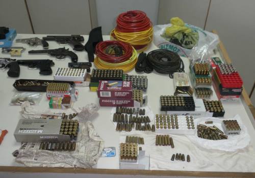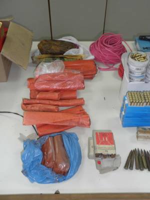 Συγκεκριμένα, βρέθηκαν πέντε πιστόλια, τρία περίστροφα, τέσσερις γεμιστήρες πιστολιού, περισσότερα από 2.150 φυσίγγια πιστολιού και περιστρόφου, 61 φυσίγγια πολεμικού πυροβόλου όπλου, είκοσι μασούρια ζελατοδυναμίτιδας συνολικού βάρους 6.700 γραμμαρίων, 910 γραμμάρια μόλυβδου, 45 κουτιά μελανής πυρίτιδας βάρους περίπου εννέα κιλών, 38 μέτρα ακαριαίου φυτιλιού, 45 μέτρα φυτιλιού, 900 καψύλλια, ένας πυροκροτητής, αλλά και ένα πήλινο λυχνάρι, ένα πήλινο μυροδοχείο και μια πήλινη οπή.