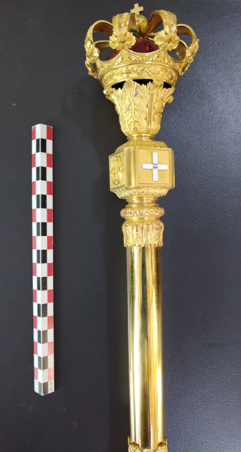 Σκήπτρο αποτελούμενο από τρία επιμήκη στελέχη που ενώνονται με κομβία διακοσμημένα. Στην επίστεψη φέρει στέμμα ολόγλυφο που στο εσωτερικό έχει διακόσμηση με σμάλτο. Στο ανώτερο κυβικό κομβίο σύνδεσης εναλλάσσεται διακόσμηση, με το μονόγραμμα του Όθωνα και σμάλτο με λευκό σταυρό. Στην ένωση των κεραιών διακρίνονται τα χρώματα της βαυαρικής σημαίας. Ακολουθεί στέλεχος, χωρίς διακόσμηση και κομβίο με αντίστοιχη διακόσμηση, όπου αντί για το μονόγραμμα του Όθωνα απεικονίζονται ολόσωμοι αντωποί λέοντες. Το κεντρικό στέλεχος είναι ολόκληρο διακοσμημένο με φυτική διακόσμηση άκανθας. Το κατώτερο στέλεχος απολήγει σε σφαίρα με φυτική διακόσμηση. Σε αυτό το σημείο είναι εγχάρακτη η επιγραφή του κατασκευαστή.