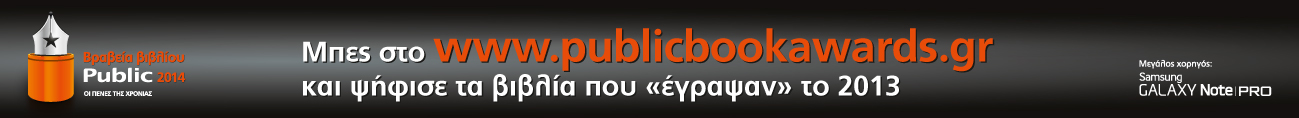 Τα καταστήματα Public, ο νούμερο ένα προορισμός για το βιβλίο, διοργανώνουν τα πρώτα Βραβεία Βιβλίου Public! Βασικός στόχος των Βραβείων Βιβλίου Public  είναι η ανάδειξη των κορυφαίων ελληνικών τίτλων που κέρδισαν τους αναγνώστες μέσα στο 2013 και να τιμήσουν τους συγγραφείς και τους εκδότες τους. Αξίζει να σημειωθεί ότι μόνο το 2013  πάνω από δύο (2) εκατομμύρια πελάτες επέλεξαν τα PUBLIC για τις αγορές των βιβλίων τους.