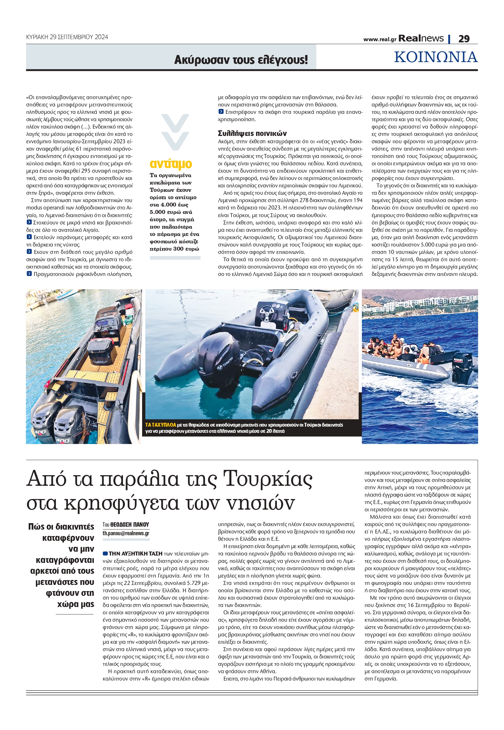 Οπως είναι σε θέση να γνωρίζει η Realnews, οι πληροφορίες που περιλαμβάνει η έκθεση του Λιμενικού έχουν διαβιβαστεί τόσο στην ΕΥΠ όσο και στον Ε’ Κλάδο του ΓΕΕΘΑ, αφού υπάρχουν υποψίες για σύνδεση ποινικών με πρόσωπα που έχουν ως στόχο ακόμη και την αποσταθεροποίηση στη χώρα. Μέχρι τώρα, ωστόσο, το σίγουρο είναι ότι με το νέο modus operandi που έχουν υιοθετήσει οι Τούρκοι διακινητές έχουν καταφέρει ακόμα και να ακυρώσουν στην πράξη τους ελέγχους που έχει ξεκινήσει η Γερμανία στα σύνορά της.