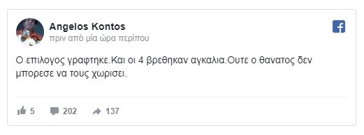 “Ο επίλογος γράφτηκε. Και οι 4 βρέθηκαν αγκαλιά. Ούτε ο θάνατος δεν μπόρεσε να τους χωρίσει” έγραψε.