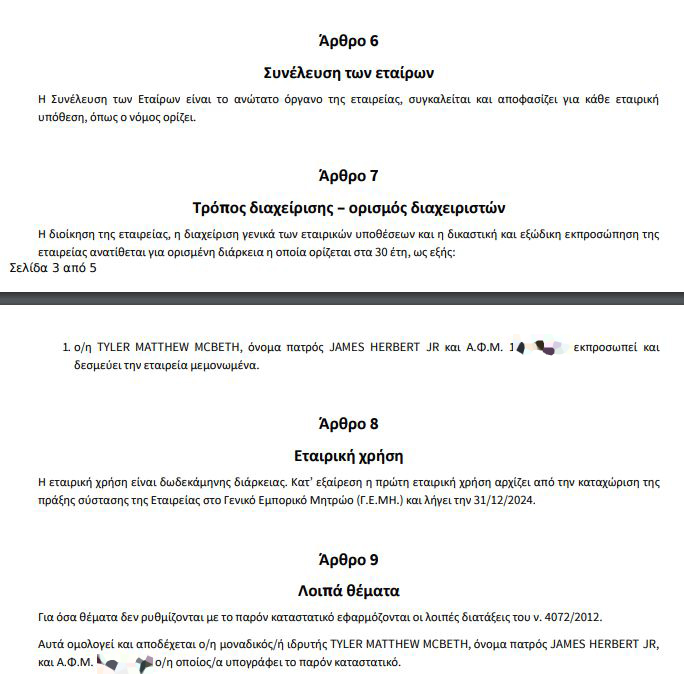 «Η διοίκηση της εταιρείας, η διαχείριση γενικά των εταιρικών υποθέσεων και η δικαστική και εξώδικη εκπροσώπηση της εταιρείας ανατίθεται για ορισμένη διάρκεια η οποία ορίζεται στα 30 έτη, στον Tyler Matthew Mcbeth, ο οποίος εκπροσωπεί και δεσμεύει την εταιρεία μεμονωμένα» διευκρινίζεται ακόμη στο έγγραφο.