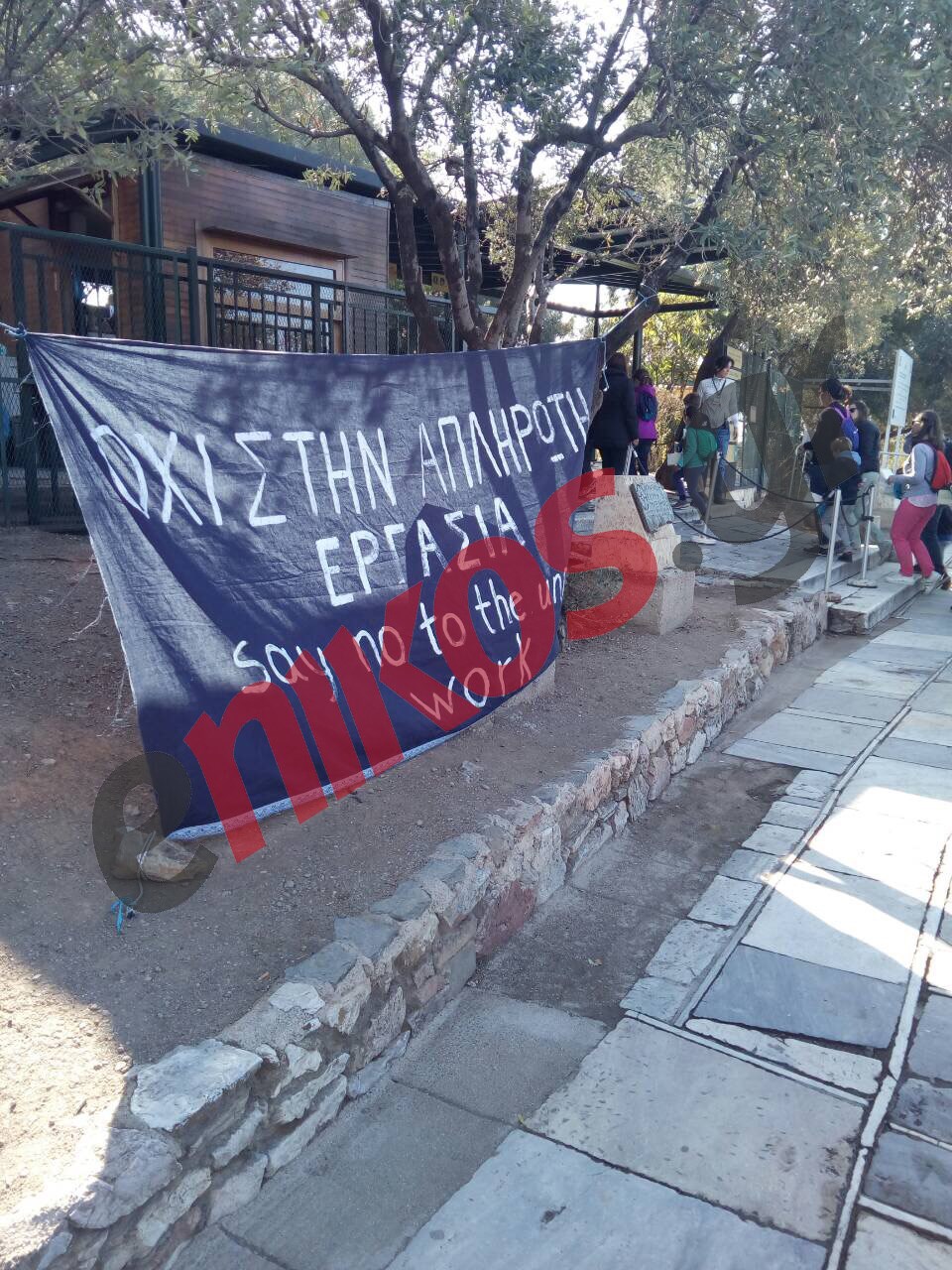 Το πανό που κρέμασαν τα μέλη του Σωματείου έγραφε στα ελληνικά και τα αγγλικά: “Όχι στην απλήρωτη εργασία”.
