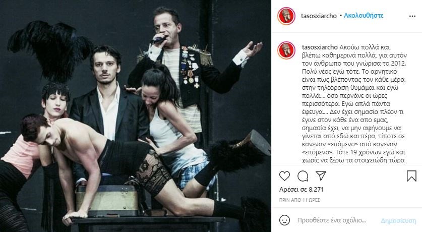 “Ακούω πολλά και βλέπω καθημερινά πολλά, για αυτόν τον άνθρωπο που γνώρισα το 2012. Πολύ νέος εγώ τότε. Το αρνητικό είναι πως βλέποντας τον κάθε μέρα στην τηλεόραση θυμάμαι και εγώ πολλά…. όσο περνάνε οι ώρες περισσότερα. Εγώ απλά πάντα έφευγα… Δεν έχει σημασία πλέον τι έγινε στον κάθε ένα από εμάς, σημασία έχει, να μην αφήνουμε να γίνεται από εδώ και πέρα, τίποτε σε κανέναν ‘επόμενο’ από κανέναν ‘επόμενο’. Τότε 19 χρόνων εγώ και χωρίς να ξέρω τα στοιχειώδη τώρα 28 ξέροντας ότι η μνήμη παίζει παιχνίδια, μπορώ να καταλάβω γιατί μου άρεσε η θέα από το μπαλκόνι του”, ήταν το μήνυμα με το οποίο συνόδευσε τη φωτογραφία ο Τάσος Ξιαρχό.