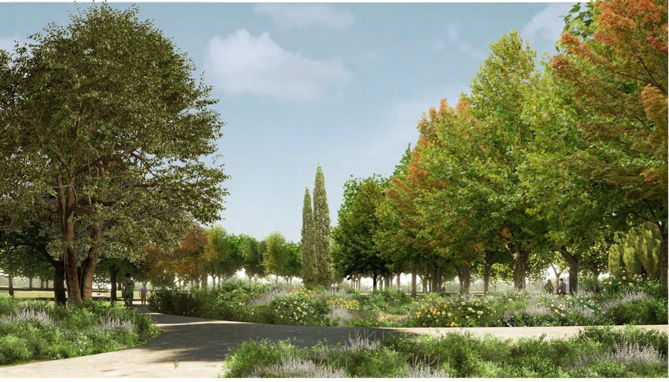 Όπως ενημερώνει η ανακοίνωση του ΥΠΠΟΑ, η περιοχή επέμβασης της μελέτης περιλαμβάνει έκταση 34 στρεμμάτων και περιμέτρου 762 μέτρων. Ο ρόλος των δένδρων είναι πολύ σημαντικός στη σύνθεση του φυτικού υλικού. Φυτεύονται περίπου 450 δένδρα. Τα μονοπάτια ακολουθούν τις αρχικές χαράξεις, όπως αυτές υφίστανται και εντοπίζονται από τα ίχνη της οριοθέτησής τους. Η δημιουργία υδατοπερατών επιφανειών συμβάλλει στην ανάπτυξη της βιοποικιλότητας διασφαλίζοντας φυσικές συνθήκες στο περιβάλλον, ευνοώντας συγχρόνως την ανάπτυξη τοπικής χλωρίδας και πανίδας.