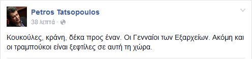 Ο Πέτρος Τατσόπουλος έγραψε στο Facebook: «Κουκούλες, κράνη, δέκα προς έναν. Οι Γενναίοι των Εξαρχείων. Ακόμη και οι τραμπούκοι είναι ξεφτίλες σε αυτή τη χώρα».