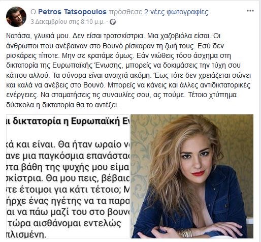 O Πέτρος Τατσόπουλος είχε γράψει στο Facebook: “Νατάσα, γλυκιά μου. Δεν είσαι τροτσκίστρια. Μια χαζοβιόλα είσαι. Οι άνθρωποι που ανέβαιναν στο βουνό ρίσκαραν τη ζωή τους. Εσύ δεν ρισκάρεις τίποτε. Μην σε κρατάμε όμως. Εάν νιώθεις τόσο άσχημα στη δικτατορία της Ευρωπαϊκής Ένωσης, μπορείς να δοκιμάσεις την τύχη σου κάπου αλλού. Τα σύνορα είναι ανοιχτά ακόμη. Έως τότε δεν χρειάζεται σώνει και καλά να ανέβεις στο βουνό. Μπορείς να κάνεις και άλλες αντιδικτατορικές ενέργειες. Να σταματήσεις τις συναυλίες σου, ας πούμε. Τέτοιο χτύπημα δύσκολα η δικτατορία θα το αντέξει”.