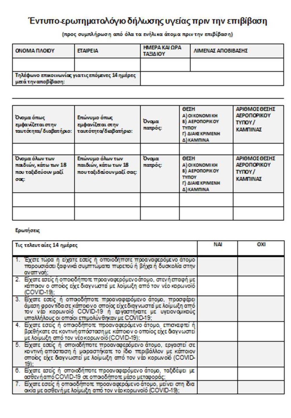 Ανάλογο ερωτηματολόγιο θα πρέπει να συμπληρώνουν αντίστοιχα τόσο οι επιβάτες, όσο και τα μέλη του πληρώματος, των πλοίων που εκτελούν δρομολόγια σε διεθνείς γραμμές (Ελλάδος – Ιταλίας).