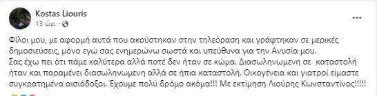 «Φίλοι μου, με αφορμή αυτά που ακούστηκαν στην τηλεόραση και γράφτηκαν σε μερικές δημοσιεύσεις, μόνο εγώ σας ενημερώνω σωστά και υπεύθυνα για την Ανυσία μου. Σας έχω πει ότι πάμε καλύτερα αλλά ποτέ δεν ήταν σε κώμα. Διασωληνωμένη σε καταστολή ήταν και παραμένει διασωληνωμένη αλλά σε ήπια καταστολή. Οικογένεια και γιατροί είμαστε συγκρατημένα αισιόδοξοι. Έχουμε πολύ δρόμο ακόμα! Με εκτίμηση, Λιούρης Κωνσταντίνος» έγραψε ο πατέρας της 25χρονης Ανυσίας.