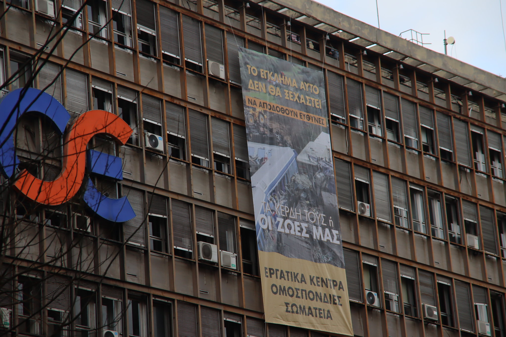 Γιγαντοπανό για τον έναν χρόνο από το τραγικό δυστύχημα των Τεμπών με 57 νεκρούς ανήρτησε το ΠΑΜΕ στην πρόσοψη του υπουργείου Ανάπτυξης και στο κτίριο του ΟΣΕ.