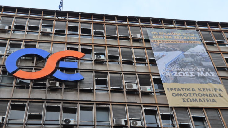«Τα κέρδη τους ή οι ζωές μας» αναγράφεται στο πανό των εργατικών σωματείων.