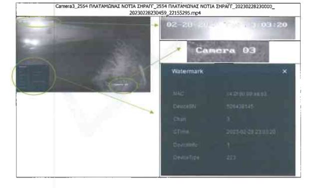 Παρομοίως, για το δεύτερο βίντεο επισημαίνεται ότι «από τη συνδυαστική ανάλυση των ανωτέρω, προκύπτει ότι το εν λόγω αρχείο αποτελεί ακριβές αντίγραφο (γνήσιο) αρχείου βίντεο που προέρχεται από την κάμερα 04 που ήταν συνδεδεμένη με το καταγραφικό με ονομασία «2546 ΚΕΚ ΡΑΨΑΝΗ σειριακού αριθμού “526438191”, μεταφορτώθηκε μέσω του λογισμικού διαχείρισης IVMS και αφορά το χρονικό διάστημα “28-02-2023 23:08:21 έως 23:42:03».