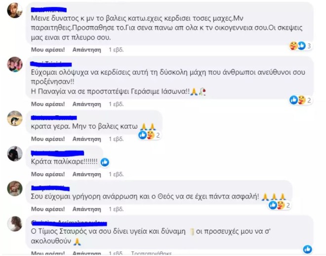 «Μείνε δυνατός και μην το βάλεις κάτω, έχεις κερδίσει τόσες μάχες. Μην παραιτηθείς», έγραψε κάποιος άλλος.