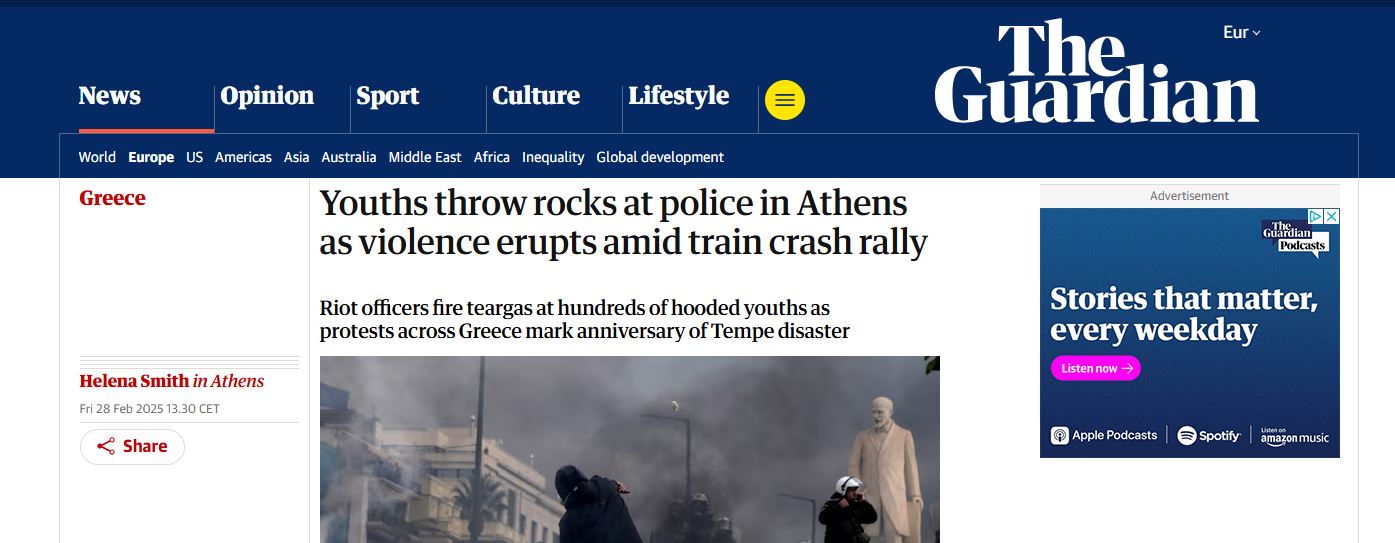Σε περίοπτη θέση ο Guardian αναφέρεται σε ρεπορτάζ τους σε διαδηλώσεις σε 200 πόλεις και κοινότητες σε όλη τη χώρα, καθώς σε κοινότητες της διασποράς, από τον Καναδά μέχρι την Αυστραλία, που γίνονται παρόμοιες διαδηλώσεις σε έκφραση της οργής που έχει προκαλέσει το σιδηροδρομικό δυστύχημα.