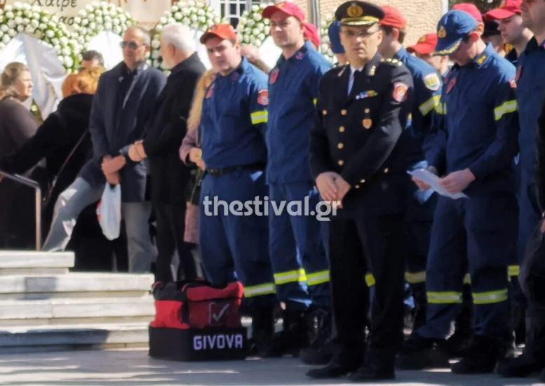 Το φέρετρο του 23χρονου ήταν καλυμμένο με την ελληνική σημαία, ενώ η μπάντα του Πυροσβεστικού Σώματος παιάνιζε πένθιμα εμβατήρια.