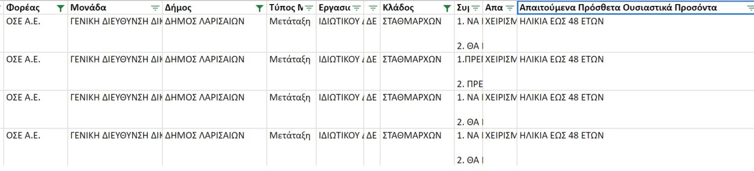 Το 2022, ο ΟΣΕ, στο πλαίσιο του 1ου κύκλου κινητικότητας έτους 2022, υπέβαλε αίτημα στην Κεντρική Επιτροπή Κινητικότητας(ΚΕΚ), μεταξύ άλλων για την κάλυψη μιας θέσης σταθμάρχη ΔΕ με σχέση ιδιωτικού δικαίου αορίστου χρόνου στη Λάρισα, με μετάταξη. Το αίτημα για τη θέση αυτή περιελάβανε το περίγραμμα της θέσης εργασίας, καθώς επίσης και τα πρόσθετα απαιτούμενα τυπικά ή ουσιαστικά προσόντα του φορέα υποδοχής ήτοι, ο υπό μετάταξη υπάλληλος να χειρίζεται ηλεκτρονικό υπολογιστή και να έχει ηλικία έως και 48 έτη.