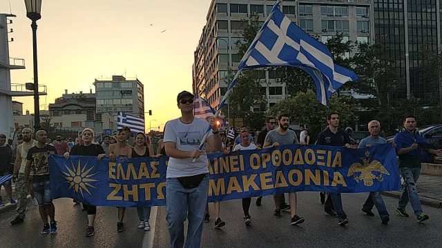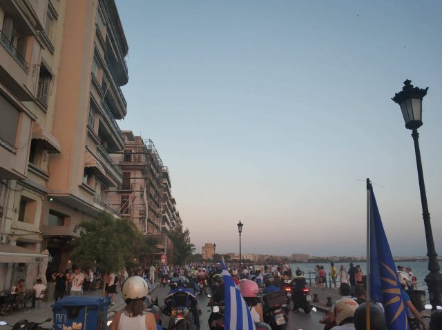 Οι μηχανές συγκεντρώθηκαν δεξιά και αριστερά στο άγαλμα του Μεγάλου Αλεξάνδρου και ο κόσμος τραγουδάει το Μακεδονία Ξακουστή καθώς φωνάζει και συνθήματα κατά των πολιτικών.