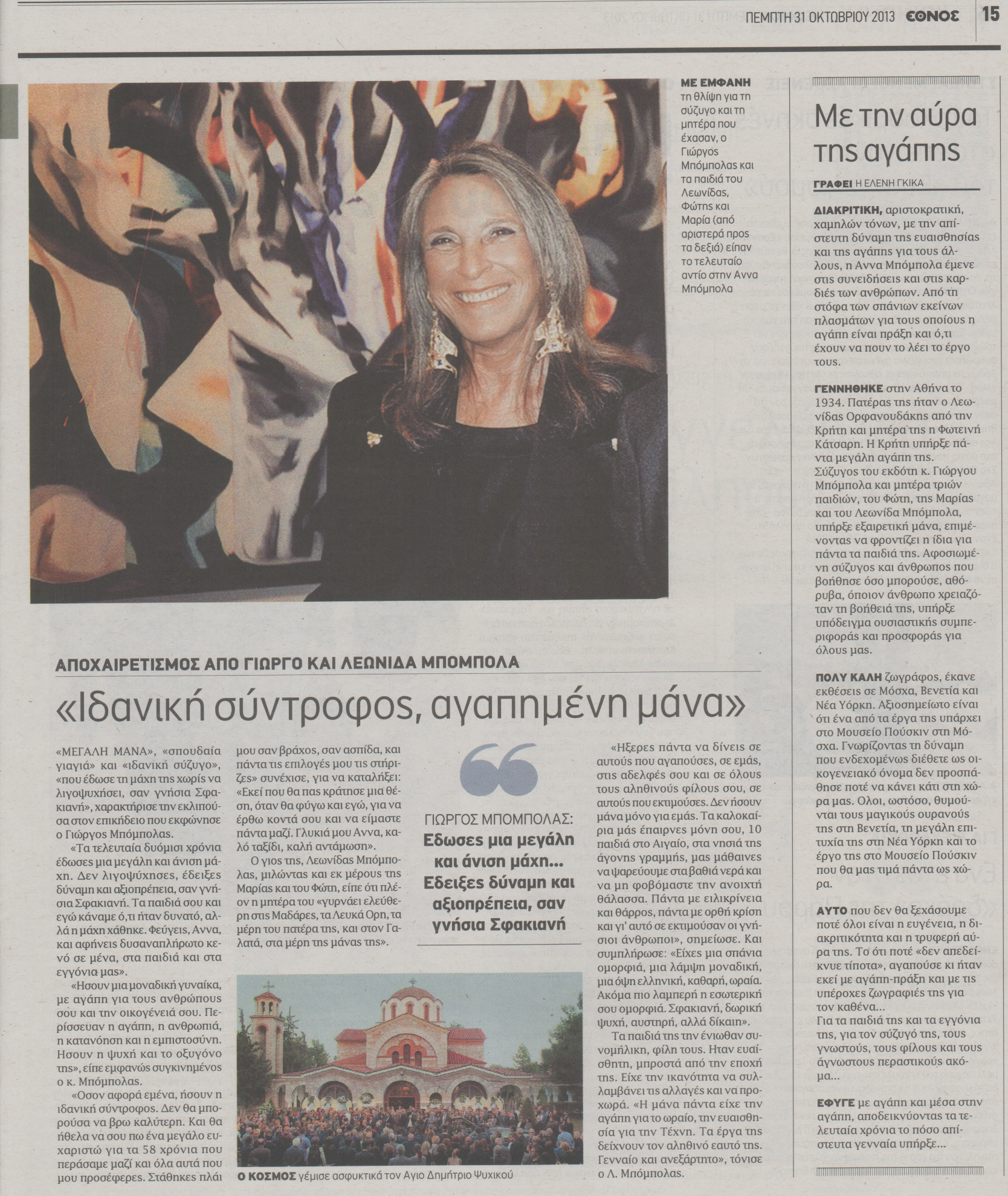 Ο σύζυγός της, εκδότης του «Έθνους», Γιώργος Μπόμπολας, την αποχαιρέτισε από καρδιάς και ευχαρίστησε τη δική του Άννα για τα 58 χρόνια που πέρασαν μαζί και για την αφοσίωσή της στην οικογένεια. «Ήσουν η ιδανική σύζυγος. Δεν θα μπορούσα να βρω καλύτερη», είπε ο κ.Μπόμπολας, για να προσθέσει ότι ήταν για την οικογένειά της η ψυχή και το οξυγόνο της.