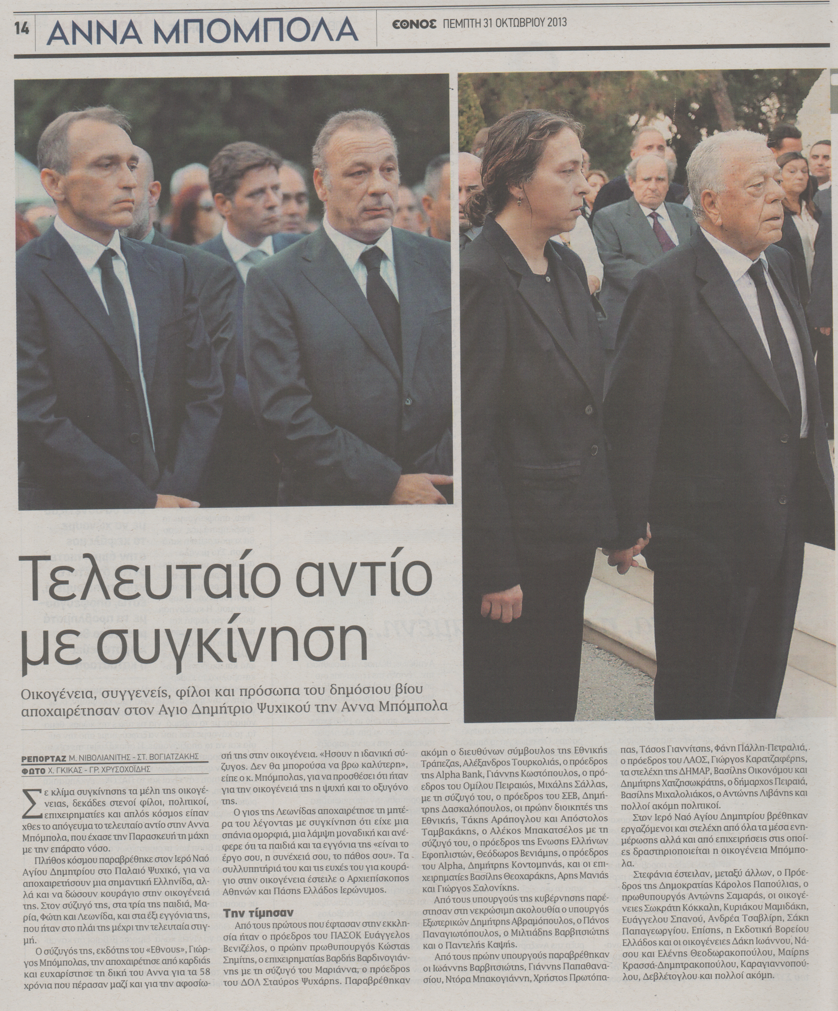 Σε κλίμα συγκίνησης τα μέλη της οικογένειας, δεκάδες στενοί φίλοι, πολιτικοί, επιχειρηματίες και απλός κόσμος είπαν χθες το απόγευμα το τελευταίο αντίο στην Άννα Μπόμπολα, η οποία έχασε τη μάχη με την επάρατη νόσο.