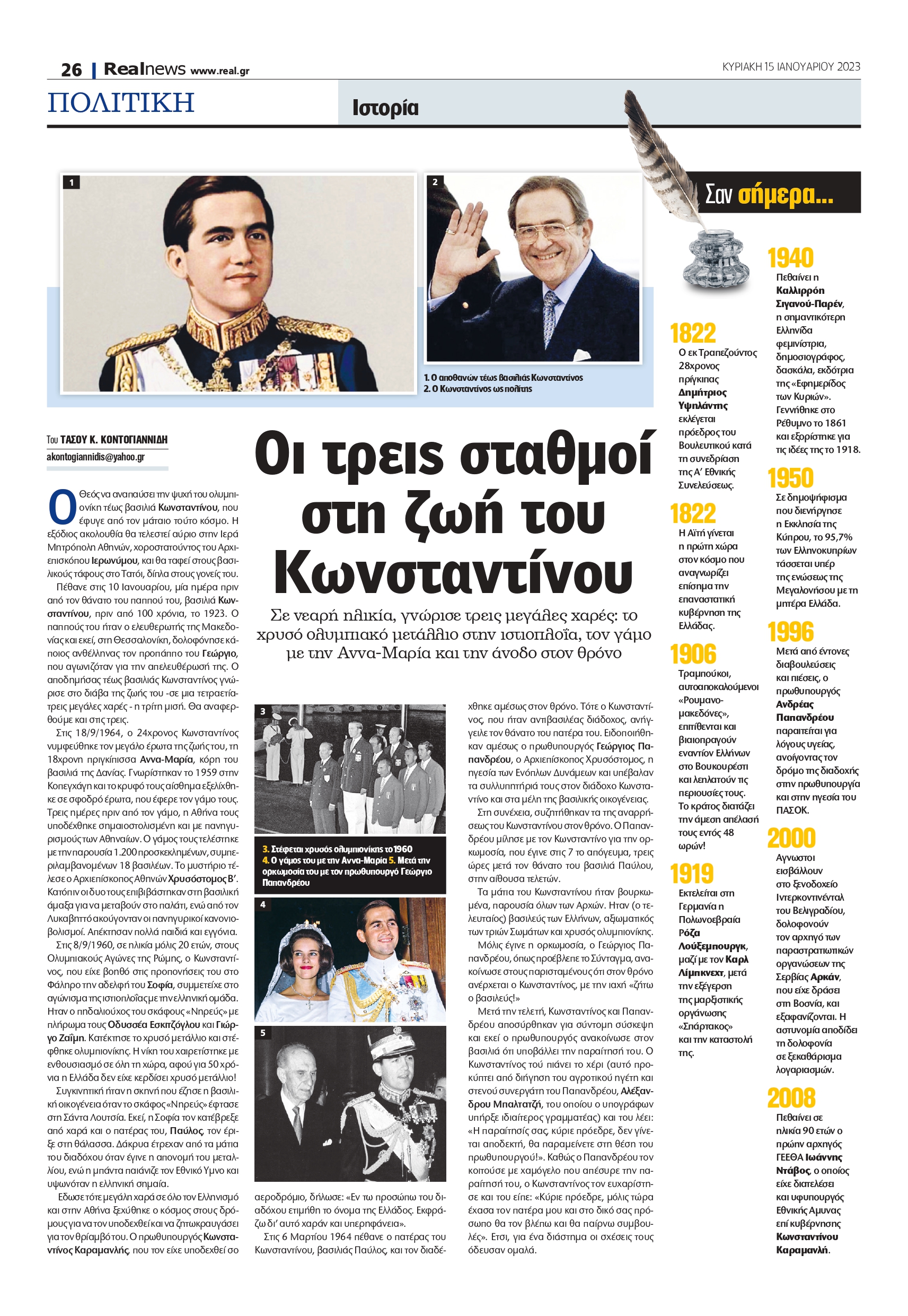 Ο τέως βασιλιάς πέθανε στις 10 Ιανουαρίου, μία ημέρα πριν από τον θάνατο του παππού του, βασιλιά Κωνσταντίνου, πριν από 100 χρόνια, το 1923. Ο παππούς του ήταν ο ελευθερωτής της Μακεδονίας και εκεί, στη Θεσσαλονίκη, δολοφόνησε κάποιος ανθέλληνας τον προπάππο του Γεώργιο, που αγωνιζόταν για την απελευθέρωσή της. Ο αποδημήσας τέως βασιλιάς Κωνσταντίνος γνώρισε στο διάβα της ζωής του -σε μια τετραετία- τρεις μεγάλες χαρές – η τρίτη μισή. Θα αναφερθούμε και στις τρεις.