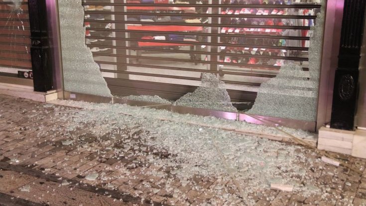 Κατά τη διάρκεια της πορείας, οι διαδηλωτές με πέτρες, ρόπαλα και σφυριά έσπασαν δεκάδες βιτρίνες προκαλώντας τεράστιες ζημιές στα καταστήματα του πιο εμπορικού δρόμου της Αθήνας, και μάλιστα εν μέσω των εκπτώσεων.