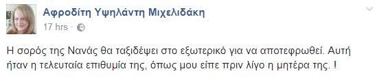 “Η σορός της Νανάς θα ταξιδέψει στο εξωτερικό για να αποτεφρωθεί. Αυτή ήταν η τελευταία επιθυμία της, όπως μου είπε πριν λίγο η μητέρα της!”.