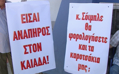 Μέλη του Συλλόγου Παραπληγικών της Αν. Στερεάς κατέλαβαν νωρίτερα τα γραφεία του ΕΟΠΥΥ στην Λαμία.Ο συμβολικός αποκλεισμός έγινε ως ένδειξη διαμαρτυρίας για τις περικοπές στα επιδόματα. Ένας από τους διαμαρτυρόμενους κρατούσε πανό στο οποίο έγραφε: «κ. Σόιμπλε θα φορολογήσετε και τα καροτσάκια μας;»…Πηγή: lamiastar.gr