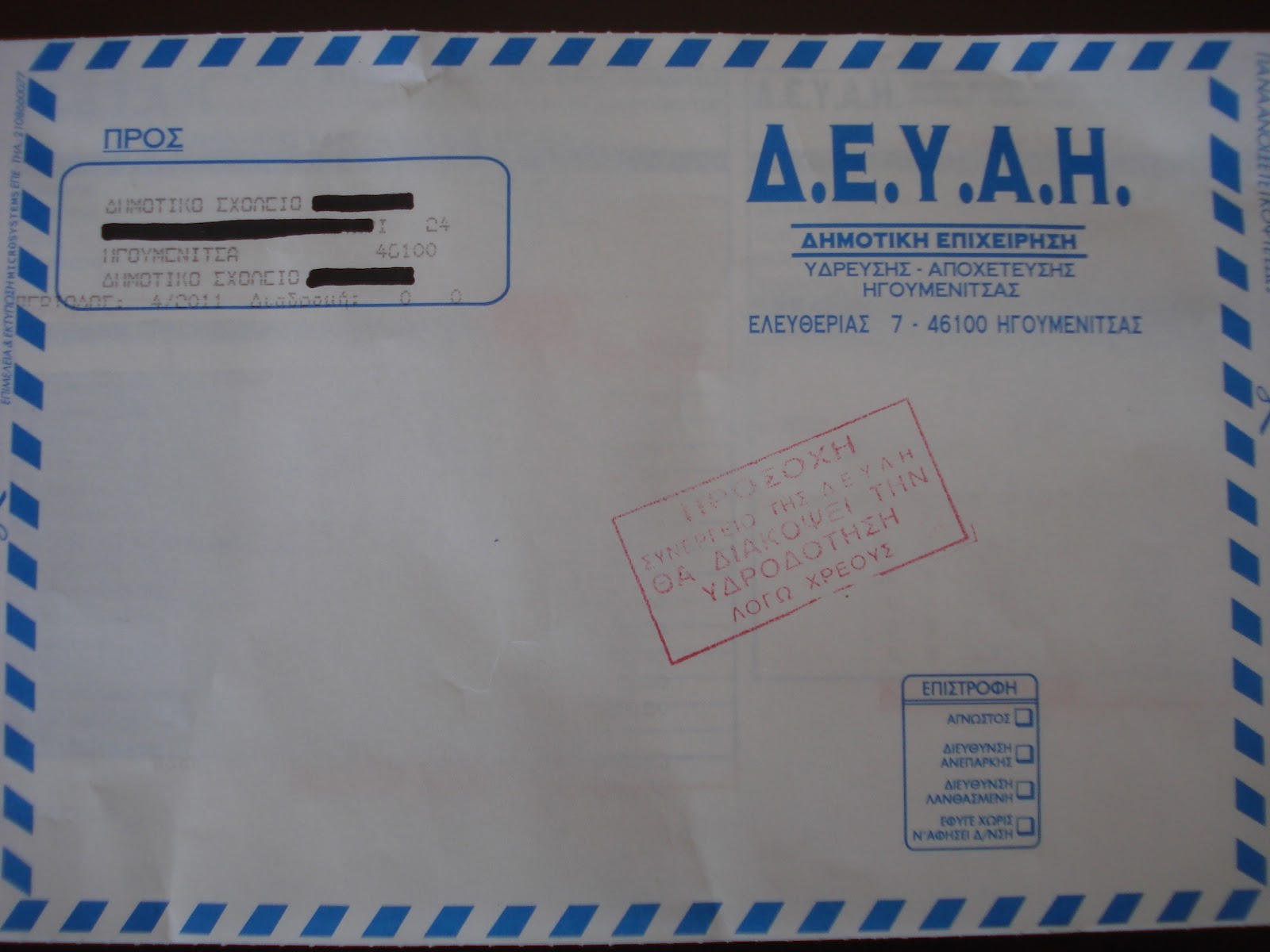 Η Δημοτική Επιχείρηση Ύδρεσης και Αποχέτευσης Ηγουμενίτσας έστειλε ειδοποιητήριο σε δημοτικό σχολείο για την εξόφληση του λογαριασμού και απειλούν να τους “κόψουν” το νερό. Πηγή: Epirusgate.blogspot.com