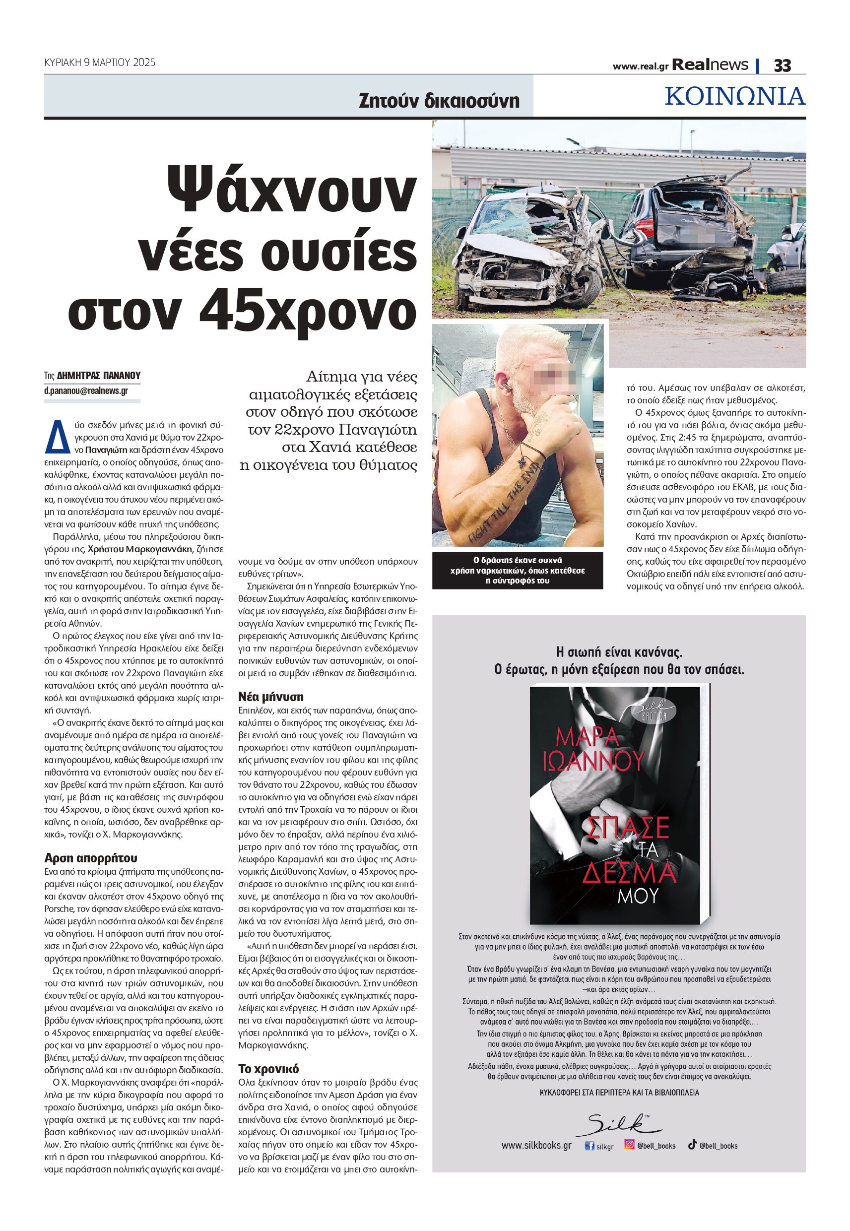 Σύμφωνα με δημοσίευμα της Realnews, δύο σχεδόν μήνες μετά τη φονική σύγκρουση στα Χανιά με θύμα τον 22χρονο Παναγιώτη και δράστη έναν 45χρονο επιχειρηματία, ο οποίος οδηγούσε, όπως αποκαλύφθηκε, έχοντας καταναλώσει μεγάλη ποσότητα αλκοόλ αλλά και αντιψυχωσικά φάρμακα, η οικογένεια του άτυχου νέου περιμένει ακόμη τα αποτελέσματα των ερευνών που αναμένεται να φωτίσουν κάθε πτυχή της υπόθεσης.