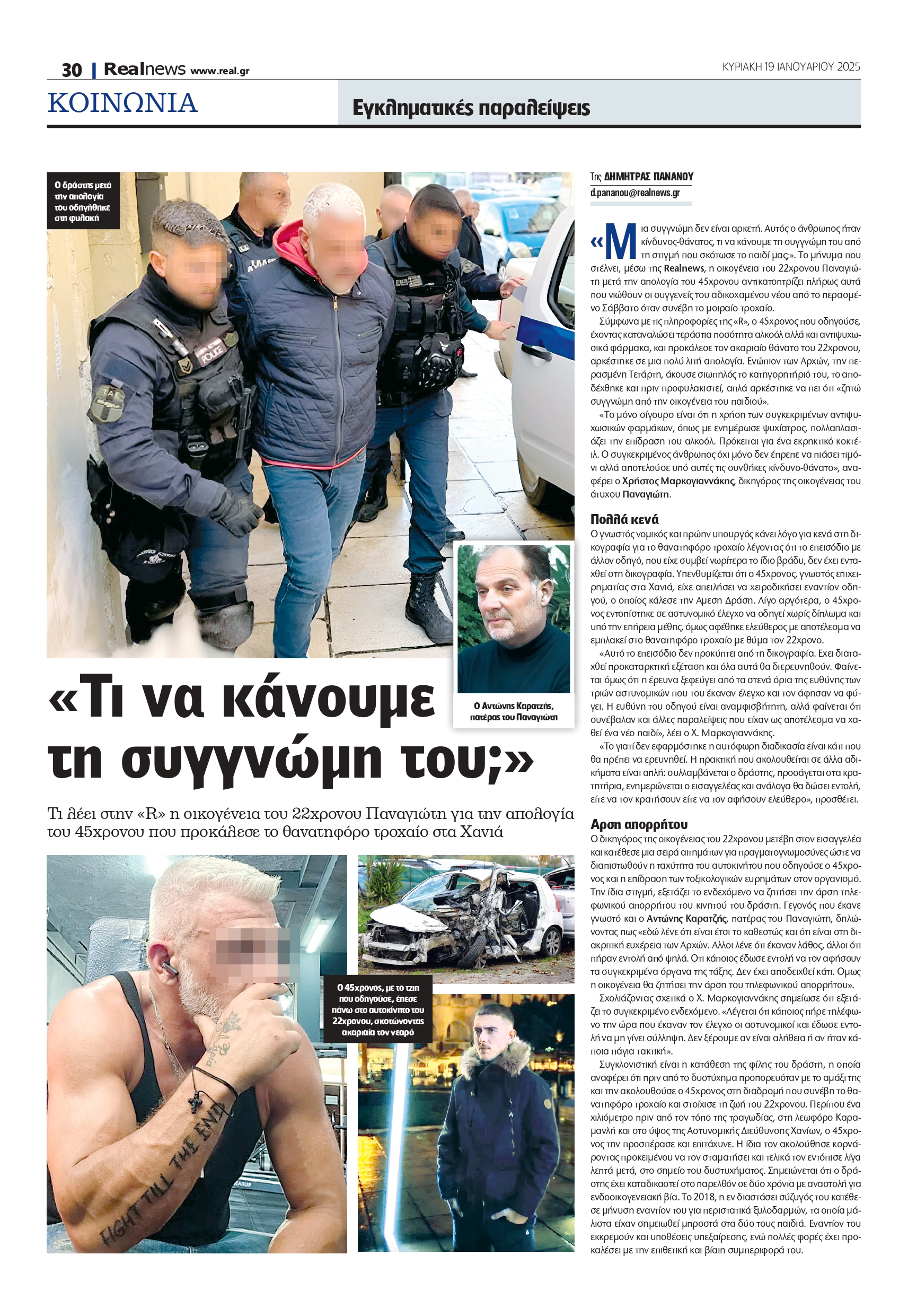 «Μια συγγνώμη δεν είναι αρκετή. Αυτός ο άνθρωπος ήταν κίνδυνος-θάνατος, τι να κάνουμε τη συγγνώμη του από τη στιγμή που σκότωσε το παιδί μας;». Το μήνυμα που στέλνει, μέσω της Realnews, η οικογένεια του 22χρονου Παναγιώτη, που έχασε την ζωή του σε τροχαίο δυστύχημα στα Χανιά, μετά την απολογία του 45χρονου οδηγού της Porsche, αντικατοπτρίζει πλήρως αυτά που νιώθουν οι συγγενείς του αδικοχαμένου νέου.