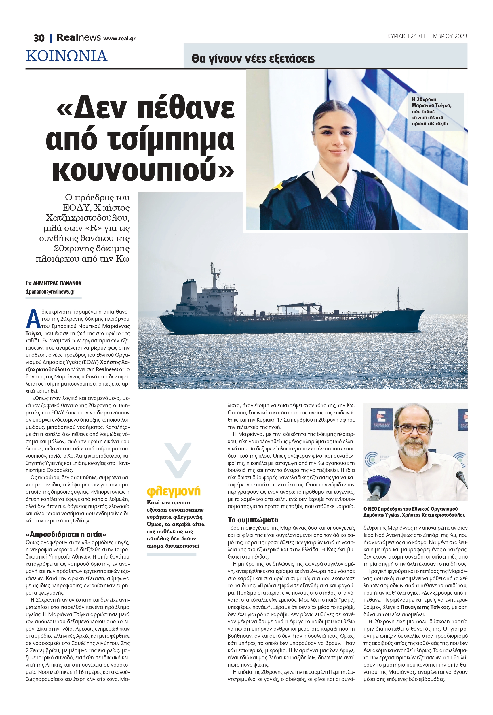 Aδιευκρίνιστη παραμένει η αιτία θανάτου της 20χρονης δόκιμης πλοιάρχου του Εμπορικού Ναυτικού Μαριάννας Τσίγκα, που έχασε τη ζωή της στο πρώτο της ταξίδι. Εν αναμονή των εργαστηριακών εξετάσεων, που αναμένεται να ρίξουν φως στην υπόθεση, ο νέος πρόεδρος του Εθνικού Οργανισμού Δημόσιας Υγείας (ΕΟΔΥ) Χρήστος Χατζηχριστοδούλου δηλώνει στη Realnews ότι ο θάνατος της Μαριάννας πιθανότατα δεν οφείλεται σε τσίμπημα κουνουπιού, όπως είχε αρχικά εκτιμηθεί.