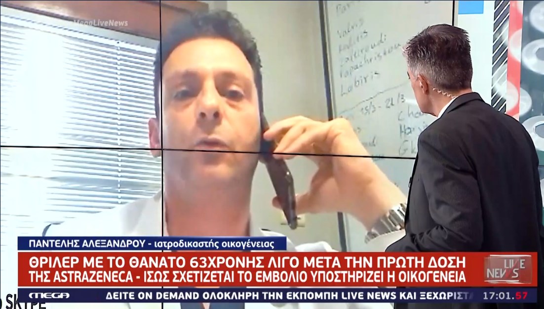 Ανοικτά όλα τα ενδεχόμενα σχετικά με τον θάνατο της 63χρονης στο Ίλιον λίγα λεπτά μετά τον εμβολιασμό της άφησε σε συνέντευξή του του στο Mega ο ιατροδικαστής της οικογένειας, Παντελής Αλεξάνδρου, ο οποίος, μάλιστα, έκανε και μία δήλωση που θα συζητηθεί, για το εμβόλιο της Astrazeneca.