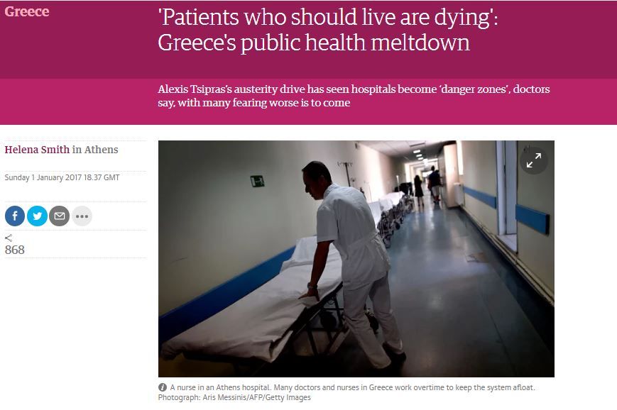 Τα ποσοστά θνησιμότητας ανεβαίνουν, οι απειλητικές για τη ζωή ενδονοσοκομειακές λοιμώξεις αυξάνονται και η έλλειψη προσωπικού και ιατρικού εξοπλισμού αποδυναμώνουν το σύστημα υγείας στην Ελλάδα, καθώς η λιτότητα στη χώρα πλήττει τις αδύναμες κοινωνικές ομάδες, αναφέρεται σε δημοσίευμα του Guardian υπό τον τίτλο «Ασθενείς που θα έπρεπε να ζουν πεθαίνουν – Το Δημόσιο Σύστημα Υγείας στην Ελλάδα καταρρέει».