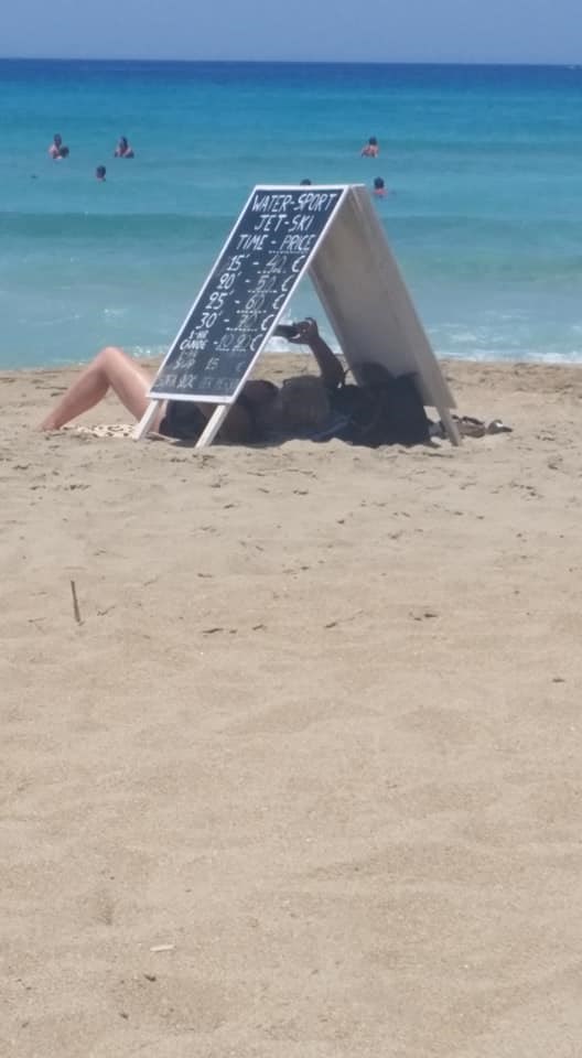 Έτσι προκειμένου να προφυλάξει το κεφάλι της από τον ήλιο, μπήκε κάτω από τον τιμοκατάλογο για τα θαλάσσια αθλήματα.