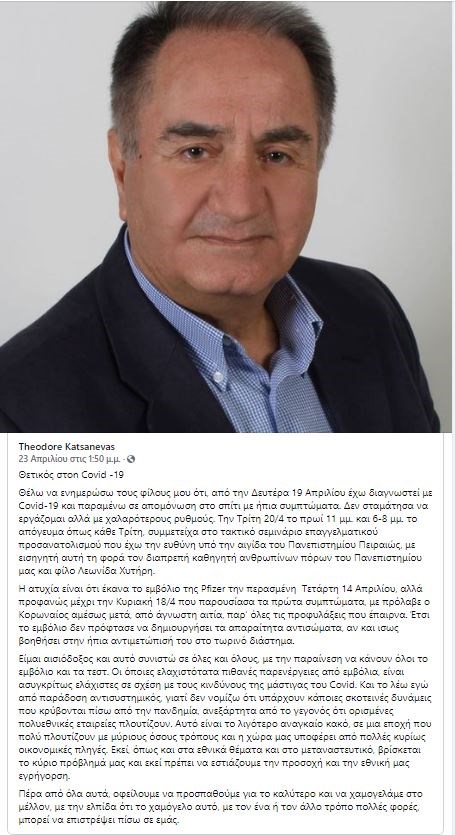 Θέλω να ενημερώσω τους φίλους μου ότι, από την Δευτέρα 19 Απριλίου έχω διαγνωστεί με Covid-19 και παραμένω σε απομόνωση στο σπίτι με ήπια συμπτώματα. Δεν σταμάτησα να εργάζομαι αλλά με χαλαρότερους ρυθμούς. Την Τρίτη 20/4 το πρωί 11 μμ. και 6-8 μμ. τo απόγευμα όπως κάθε Τρίτη, συμμετείχα στο τακτικό σεμινάριο επαγγελματικού προσανατολισμού που έχω την ευθύνη υπό την αιγίδα του Πανεπιστημίου Πειραιώς, με εισηγητή αυτή τη φορά τον διαπρεπή καθηγητή ανθρωπίνων πόρων του Πανεπιστημίου μας και φίλο Λεωνίδα Χυτήρη.
